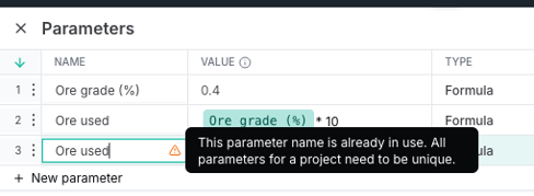 - A new row is created with a default name. You can rename it, but names must be unique within the project. If a name already exists, you’ll see a warning icon.