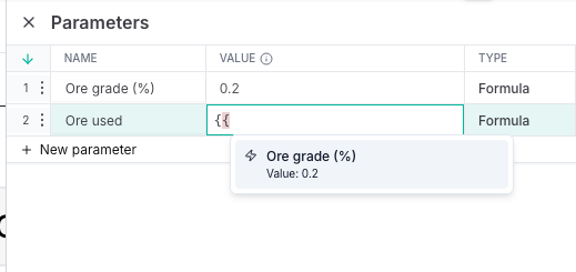 - Enter a value or formula for the parameter. Formulas can include other parameters, referenced using double curly brackets,