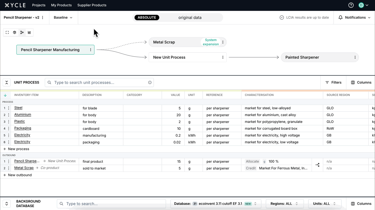 Within the scenario, navigate to the same modelling interface you’re familiar with. You can adjust any field, such as values, suppliers, background data, or allocation methods.